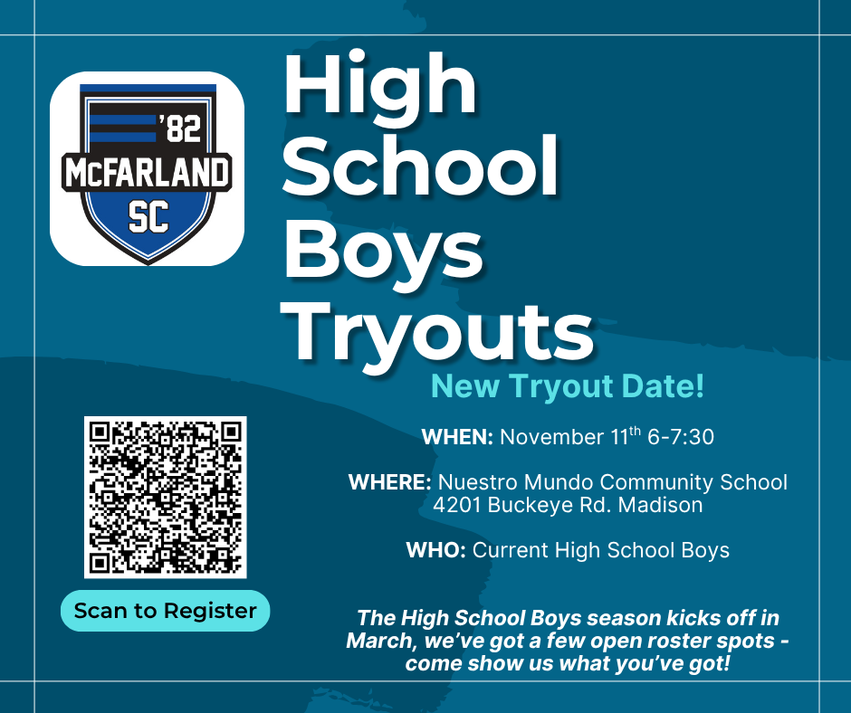 We’re excited to announce an additional tryout date for our High School Boys teams. When: November 11th | 6:00–7:30 PM Where: Nuestro Mundo Community School, 4201 Buckeye Rd, Madison Who: Current high school boys The High School Boys season begins in March , and we currently have a few open roster spots available. If you’re ready to compete and be part of McFarland SC, don’t miss your chance — register today by scanning the QR code or visiting our website.